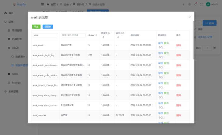 数据库名称后我们可以查看数据库表信息、进行表管理和导出操作;