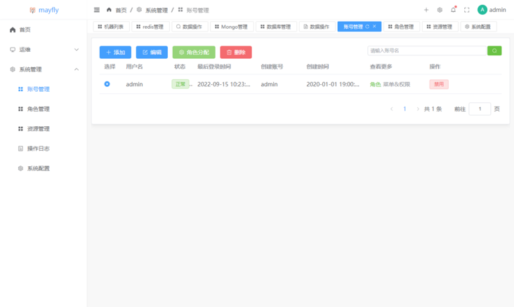 账号管理中我们可以对账号进行管理,支持角色分配;