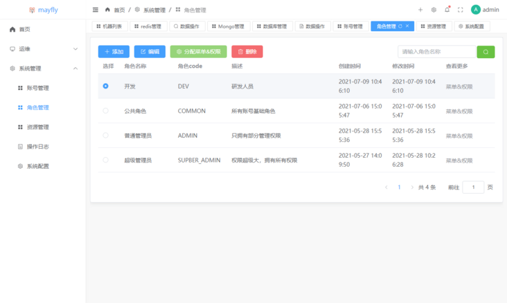 mayfly-go还提供了完整的权限管理功能,支持对账号的角色以及资源进行分配。