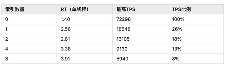例如,产品A不带索引能跑到10W的TPS,带一个索引跑到5W,那我们就认为带一个索引的情况下是基线的50%。这个百分比我们不妨称之为TPS百分比。