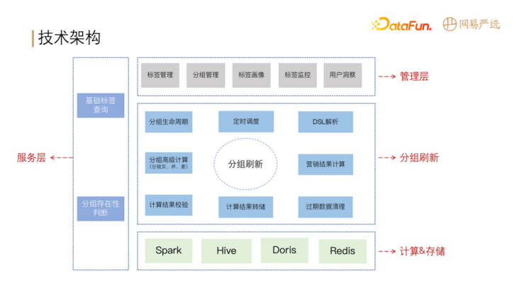 所有的标签元信息存储在源数据表中;调度层对业务的整个流程进行任务调度:数据处理、聚合转化为基础标签,基础标签和源表中的数据通过 DSL 规则转化为可用于数据查询的 SQL 语义,由调度层将任务调度到计算存储层的 Spark 进行计算,将计算结果存储到 Hive 和 Doris 中。服务层由标签服务、实体分组服务、基础标签数据服务、画像分析服务四部分组成。