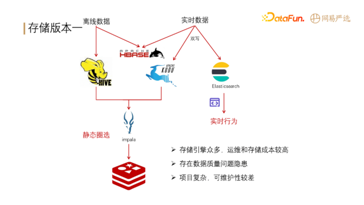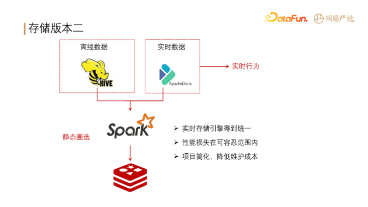 存储架构版本二引入了 Apache Doris,离线数据主要存储在 Hive 中,同时将基础标签导入到 Doris,实时数据也存储在 Doris,基于 Spark 做 Hive 加 Doris 的联合查询,并将计算出来的结果存储在 Redis 中。经过此版改进后,实时离线引擎存储得到了统一,性能损失在可容忍范围内(Hbase 的查询性能比 Doris 好一些,能控制在 10ms 以内,Doris 目前是 1.0 版本,p99,查询性能能控制在 20ms 以内,p999,能控制在 50ms 以内);项目简化,降低了运维成本。