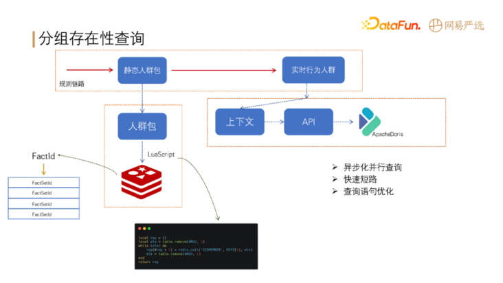 - 第二部分为实时行为人群,需要从上下文、API 和 Apache Doris 中提取数据进行规则判断。性能提升方案包括,异步化查询、快速短路、查询语句优化、控制 Join表数量等。