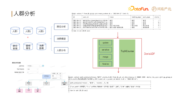 还有一个场景是人群分析:人群分析需要将人群包数据同多个表进行联合查询,分析行为路径。目前 Doris 还不支持路径分析函数,因此我们开发了 DorisUDF 来支持此业务。Doris 的计算模型对自定义函数的开发还是很友好的,能够比较好地满足我们的性能需要。