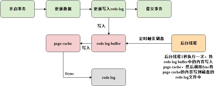 InnoDB引擎有一个后台线程,其1秒执行一次,会将redo log buffer的内容写入page cache,然后再调用