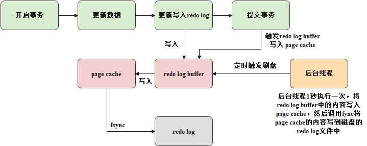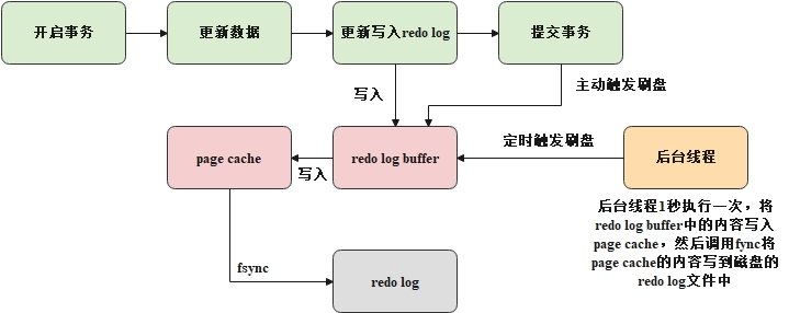 函数将page cache中的内容刷到磁盘上; - innodb_flush_log_at_trx_commit为2,表示每次提交事务时,仅将redo log buffer内容写入page cache。