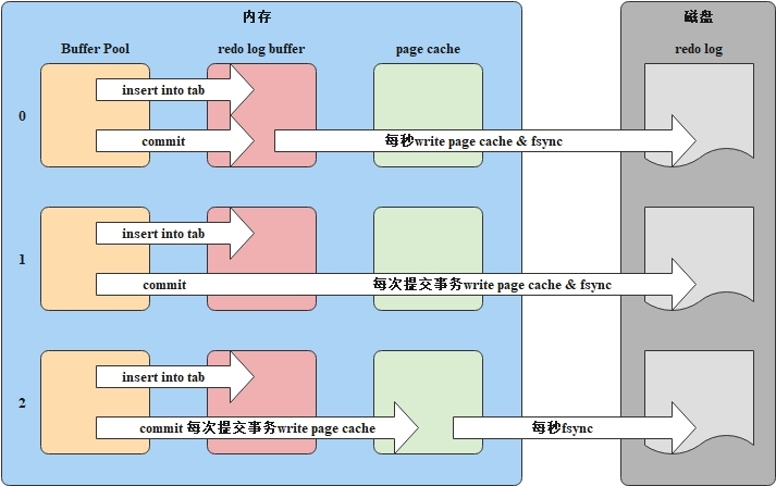 fsync函数将page cache中的内容写到磁盘的redo log文件中,所以innodb_flush_log_at_trx_commit的值无论设置为0,1或者2,最终都是可以将redo log buffer的内容写到磁盘的redo log文件中的。下面给出innodb_flush_log_at_trx_commit被设置为不同值时的刷盘示意图。