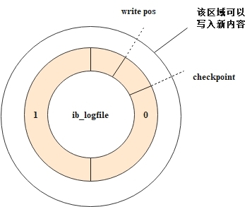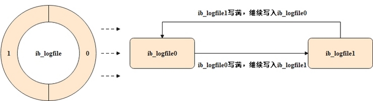 InnoDB引擎中,默认情况下磁盘上的redo log文件个数为2,每个redo log文件大小为48MB,这两个redo log文件组成了一个日志文件组,整体是一个环形结构,从头到尾进行循环写入,示意图如下。