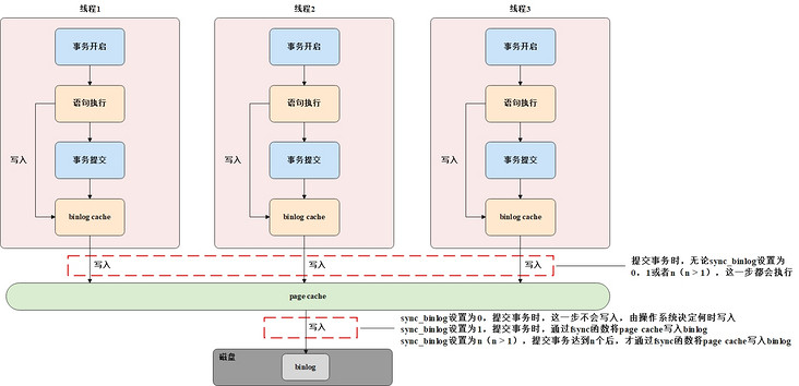 函数将page cache的内容写到binlog; - sync_binlog设置为n(n > 1),表示每次提交事务时,会将binlog cache的内容写入page cache,当向page cache写入数据的事务达到n个,此时调用