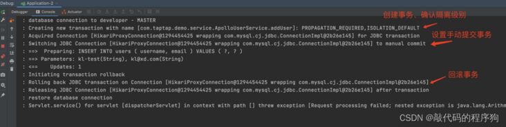 随后,我在 java-project 项目里,使用相同的 MySQL 测试了下,发现事务回滚成功了。说明这个问题仅仅影响特定的环境,而且可以通过对比两个项目的差异找到问题,离真相更近了。