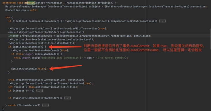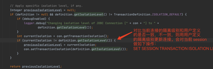 事出反常必有妖,本着不信是隔离级别导致的问题,我在 store 项目里将 isolation 设置成 Isolation.READ_UNCOMMITTED ,发现事务回滚也生效了。这也说明了和隔离级别没有直接的关系。然后本着探究【为啥默认的原因 READ_COMMITTED 导致事务不生效?】的思路排查了下,发现了些问题,如下代码是事务逻辑中的一部分(源码见:DataSourceUtils.prepareConnectionForTransaction ()):
