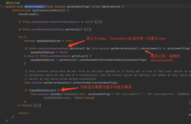 所以到这里就结束了吗?并没有,预期是即使 useLocalSessionState=ture ,事务也应该完整。然后别忘了 isAutoCommit () 和 isAutocommit () 的差异。先来看下他们的定义:
