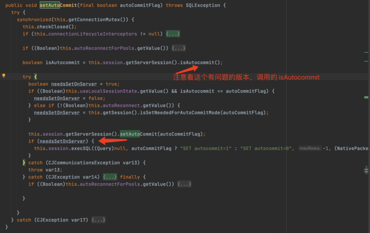 }原来在 mysql-connector-java:8.0.28 驱动里,使用 statusFlags 状态代替了 autoCommit 的标识(这里先不考究为什么做这个改动),这个解释了