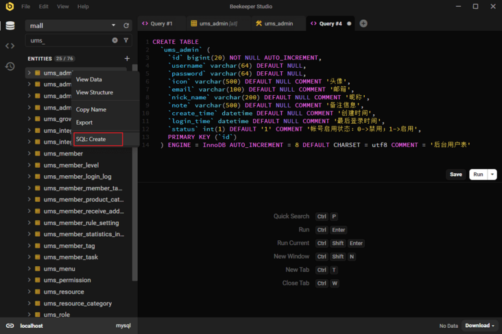 - 右键菜单还可以查看表的创建语句,这SQL主题样式,确实挺漂亮的;