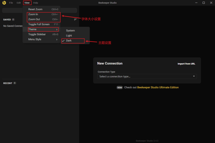 View菜单按钮进行字体大小和主题设置,我们把它切换到更炫酷的深色主题。