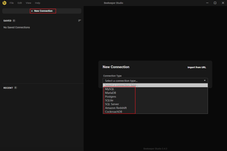 按钮来创建数据源,这里我们可以发现Beekeeper Studio仅支持常用的几种关系型数据库;