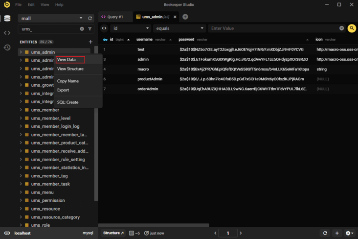 - 右键表名点击菜单可以选择查看表中的数据;