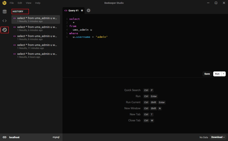 - 通过左侧按钮我们还可以查看执行SQL的历史记录。