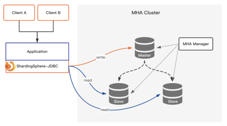 除了 Sharding,同时还启用 ShardingSphere 读写分离功能,充分利用 MHA 集群资源,提升系统吞吐能力。