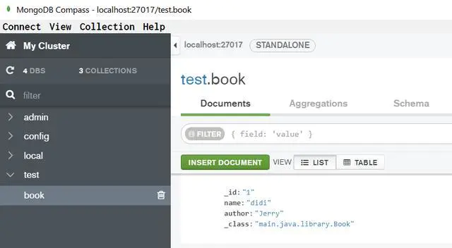 假设我本地 MongoDB 的数据库里有一张表 book,只有一条记录,id 为 1.