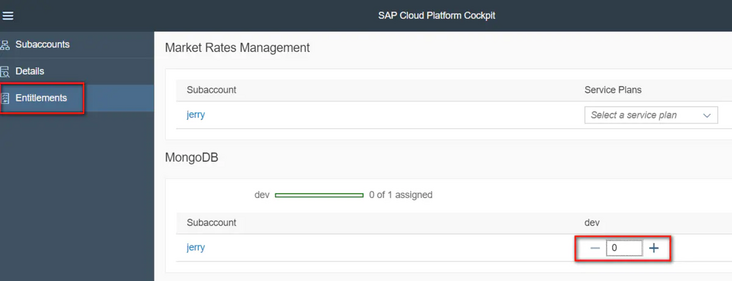 退回到 SAP 云平台的 Global Account,点击 Entitlement,发现没有给 Subaccount 分配 MongoDB: