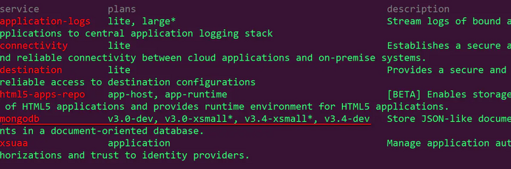 cf marketplace现在能够看到 MongoDB 服务的版本了: