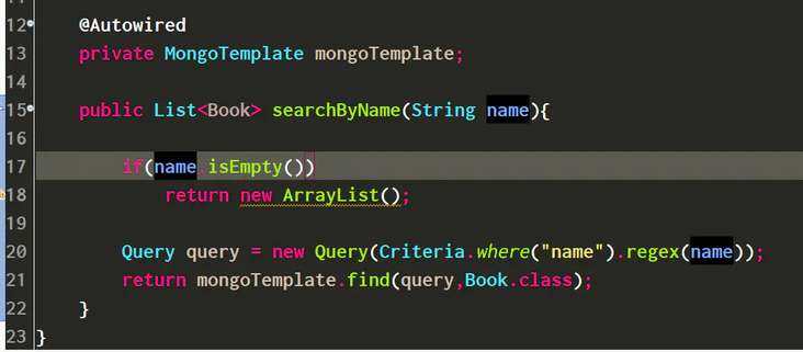 findByName 的实现:第 20 行代码构造一个 Query 实例,然后将其传入 21 行