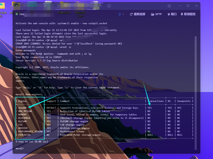 但是当再次重启客户端时,默认存储引擎仍然是