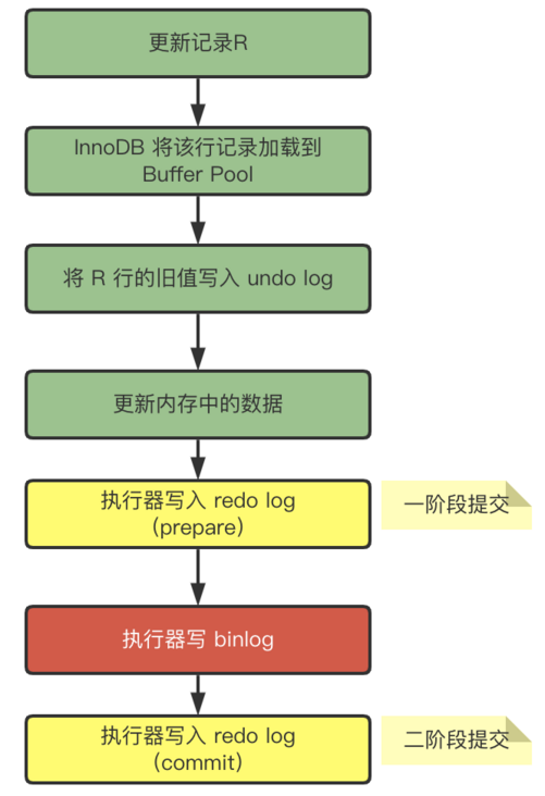 在 MySQL 中,两阶段提交的主角就是 binlog 和 redolog,我们来看一个两阶段提交的流程图:
