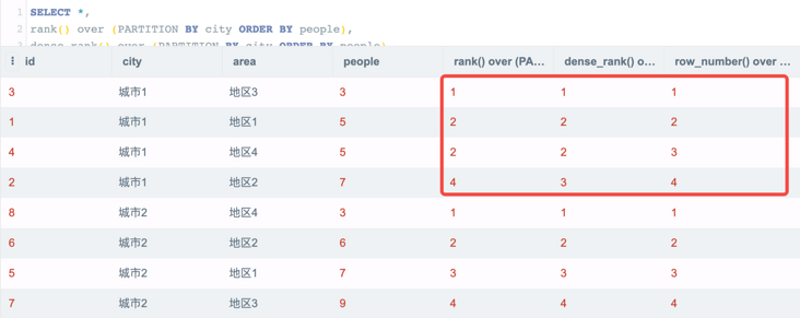 SELECT *, rank() over (PARTITION BY city ORDER BY people), dense_rank() over (PARTITION BY city ORDER BY people), row_number() over (PARTITION BY city ORDER BY people) FROM test