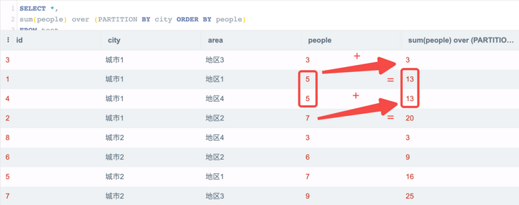 可以看到,在每个 city 分组内,按照 people 排序后进行了 累加(相同的值会合并在一起),这就是 BI 工具一般说的 RUNNGIN_SUM 的实现思路,当然一般我们排序规则使用绝对不会重复的日期,所以不会遇到第一个红框中合并计算的问题。