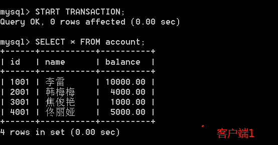 (2)在客户端1的事务提交之前,打开另一个客户端B,更新表account: