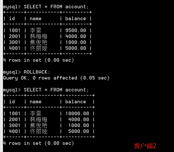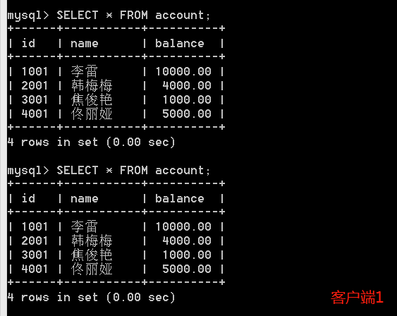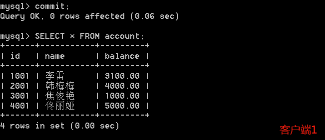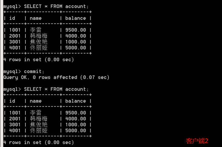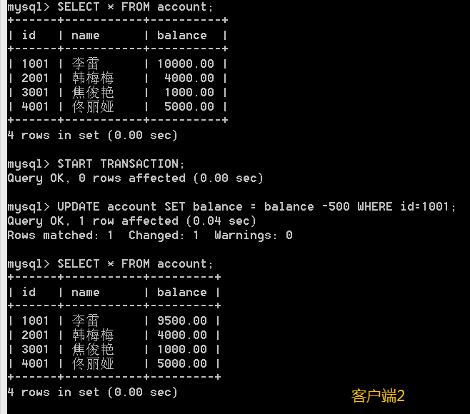 (2)在客户端A的事务提交之前,打开另一个客户端2,更新表account并提交