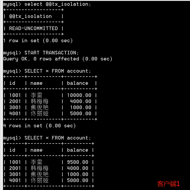 (1)打开一个客户端1,并设置当前事务模式为read uncommitted(未提交读),查询表account的初始值: