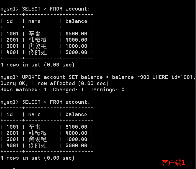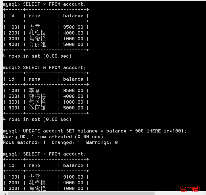 (5)在客户端1执行更新语句update account set balance = balance - 900 where id =1001,李雷的balance没有变成8600,居然是9100,是不是很奇怪,数据不一致啊,如果你这么想就太天真 了,在应用程序中,我们会用9500-900=8600,并不知道其他会话回滚了,要想解决这个问题可以采用读已提交的隔离级别
