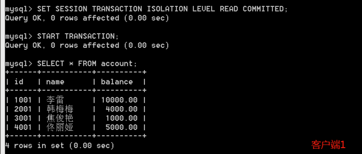 (1)打开一个客户端1,并设置当前事务模式为read committed(未提交读),查询表account的初始值: