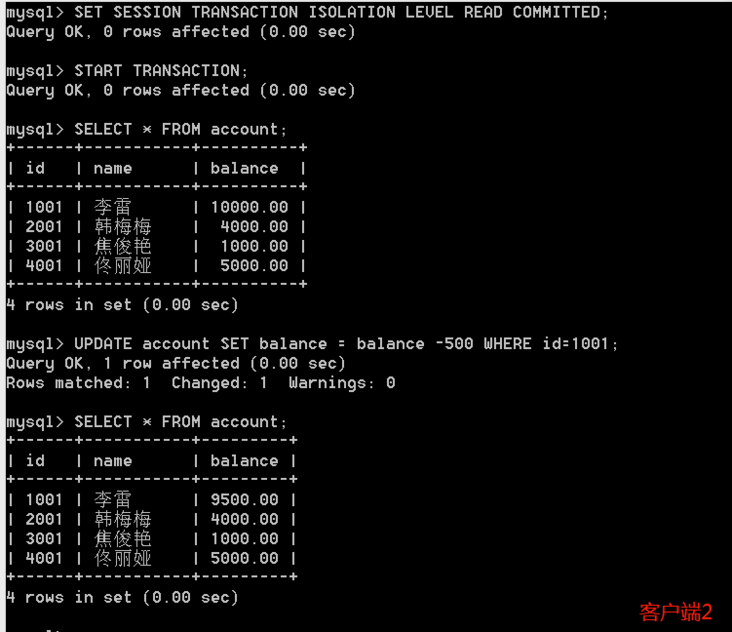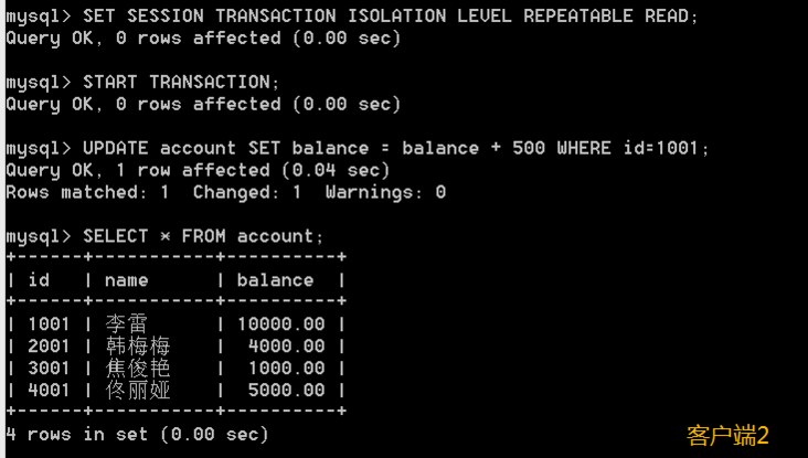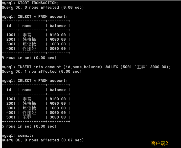 (6)在客户端2开启事务,新增一条数据,其中balance字段值为3000,并提交