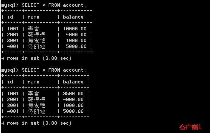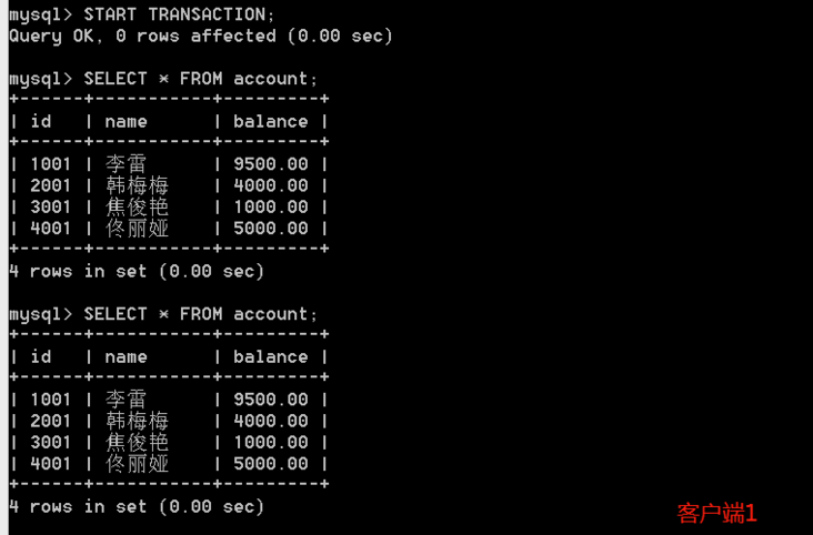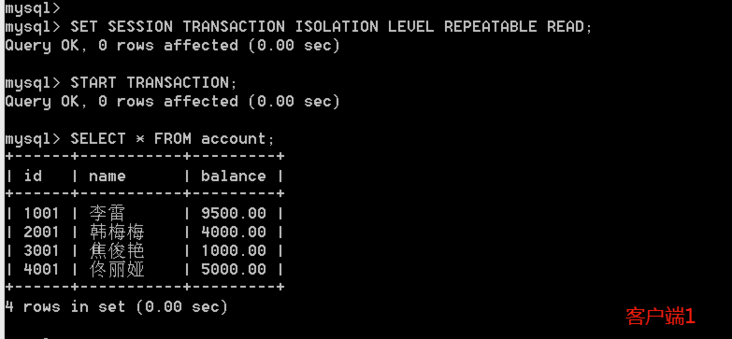 (1)打开一个客户端1,并设置当前事务模式为repeatable read,查询表account
