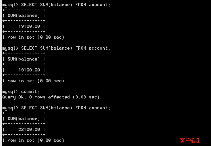 (5)客户端1执行与上一步相同的查询,结果 与上一步不一致,即产生了不可重复读的问题