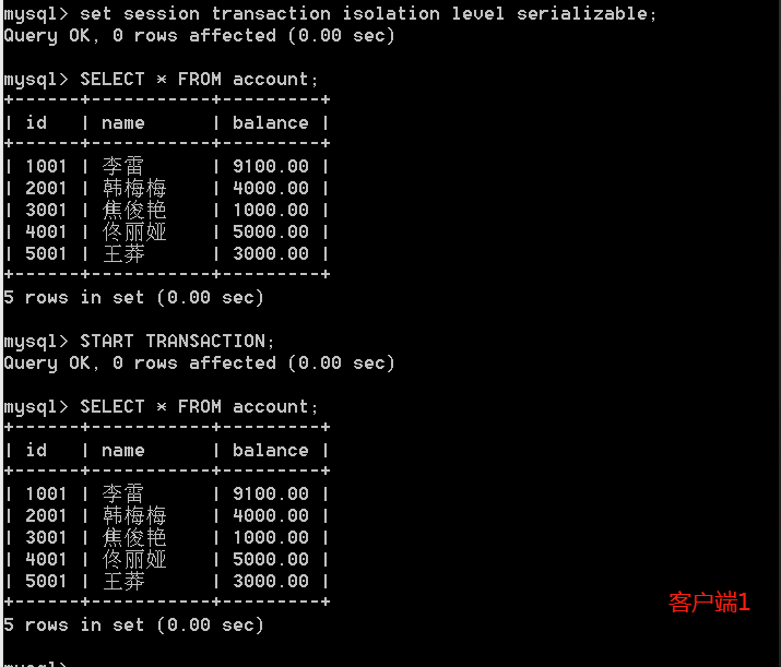 (1)打开一个客户端1,并设置当前事务模式为serializable,查询表account的初始值: