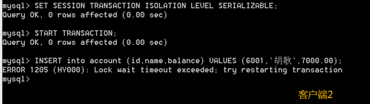 (2)打开一个客户端2,并设置当前事务模式为serializable,插入一条记录报错,表被锁了插入失败,mysql中事务隔离级别为serializable时会锁表,因此不会出现幻读的情况,这种隔离级别并发性极低,开发中很少会用到。