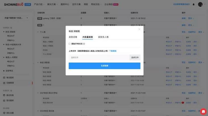 - 面试官有时候没有空抽出时间来出题,但 ShowMeBug 后台的公共题库非常专业,也极具有考察性,可以很快就创建一套试题;