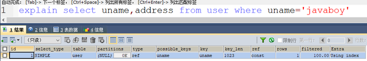 可以看到,此时使用到了 uname 索引,但是最后的 Extra 的值为