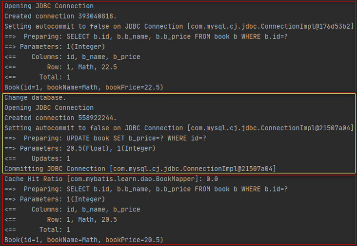 }执行结果如下所示。 ![]() 上述结果表明,会话1的第一次查询是直接查询的数据库,然后会话2执行了一次更新操作并提交了事务,此时数据库中id为1的图书的价格已经变更为了22.5,紧接着会话1又做了一次查询,但查询结果中的图书价格为20.5,说明会话1的第二次查询是从缓存获取的查询结果。所以在这里可以知道, @Override