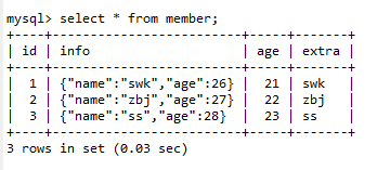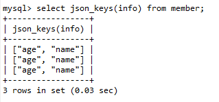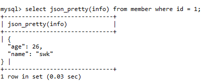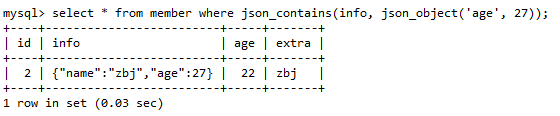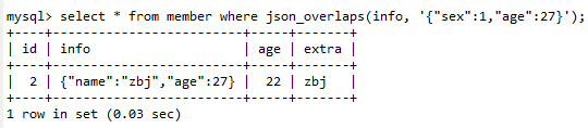 select * from member where json_overlaps(info, '{"sex":1,"age":27}');