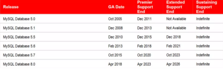 首先MySQL的每个版本有相应的Endlife周期,现阶段MySQL的Endlife周期如下: