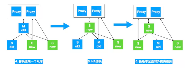 第5步, 通过HA切换把原来的Old Master切换成从库,并提供对外服务,确认没有问题时把原来最后一个从库也升级到最新版本