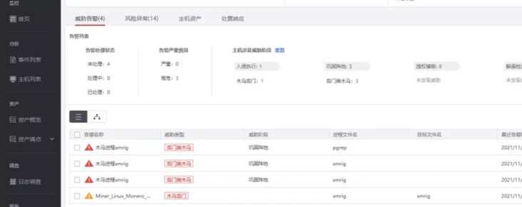 由于该漏洞利用简单,且利用代码已经公开,多个企业用户已经感知部分主机失陷,主机告警界面出现了多条告警信息,告警名称是木马进程 xmrig,研究人员根据文件的名称判定是与挖矿相关的木马。