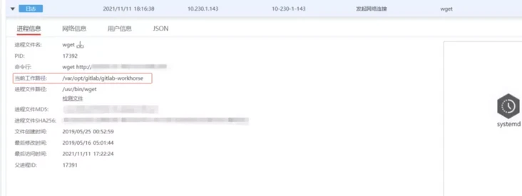 点击其中一个日志查看详情可以发现,该操作第一次发生是在 GitLab 相关的目录,初步怀疑是通过 GitLab 漏洞进来的。