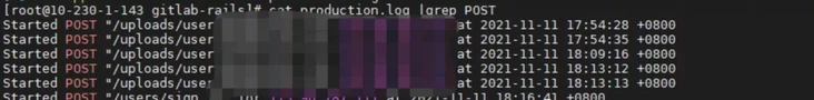 登录服务器排查,查看 GitLab 的相关日志,发现有同一可疑 IP 多次访问 GitLab,post 请求传输数据的时间与 OneEDR 产生告警时间几乎一致。